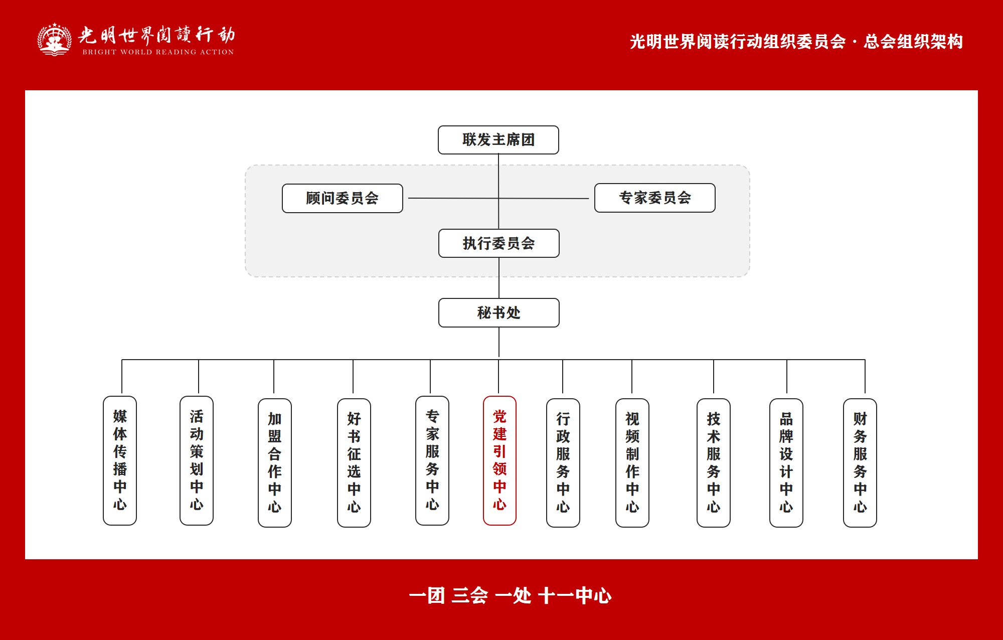 光明世界阅读行动组织委员会整体组织架构为“一团,三会,一处,十一中心”设计。